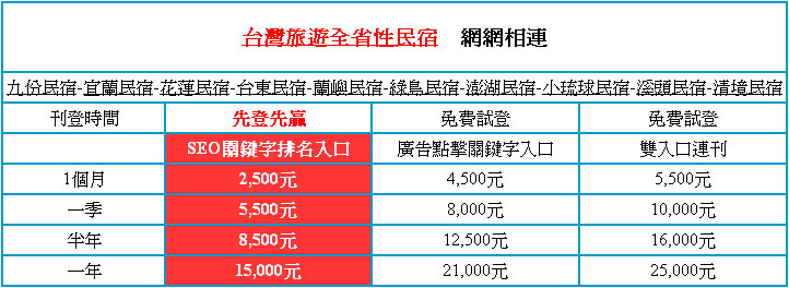 A.廣告刊登SEO排名目前在第二頁的宜蘭民宿入口是一年15,000元。